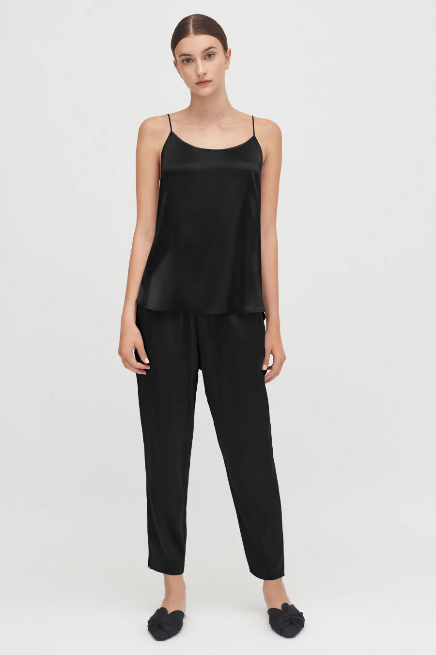Designed for a relaxed fit and easy care, our Washable Charmeuse Tapered Pant is made from luxurious silk with a practical elastic waistband, side slanted pockets, and subtle slits at bottom hems for added visual interest.